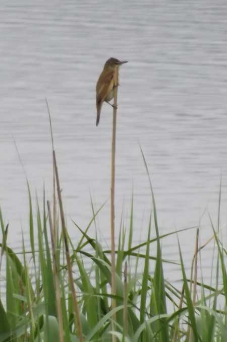 Reed Warbler sat up in the reeds in full view.| Great Reed Warbler |